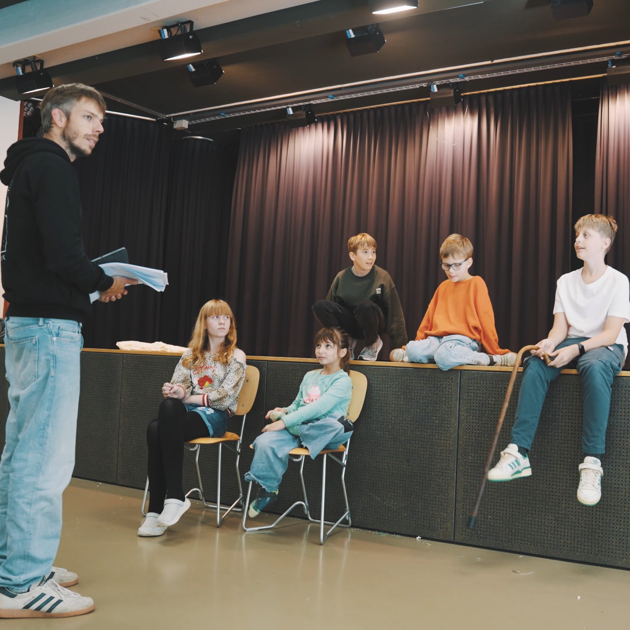 9. Oktober 2024Zweieinhalb Monate vor der Filmpremiere sind wir ohne Drehbuch in die Proben gestartet. Warum? Uns ist es wichtig, dass die Kinder nicht einfach ihre Zeilen lernen und aufsagen, sondern dass sie die gesellschaftlichen Fragen, die hinter unserem Film stehen, verstehen. So konnten wir sie altersgerecht mit dem Thema vertraut machen und mit ihnen spannende Diskussionen über die Spannungsfelder in "Heiliger Schein" führen.