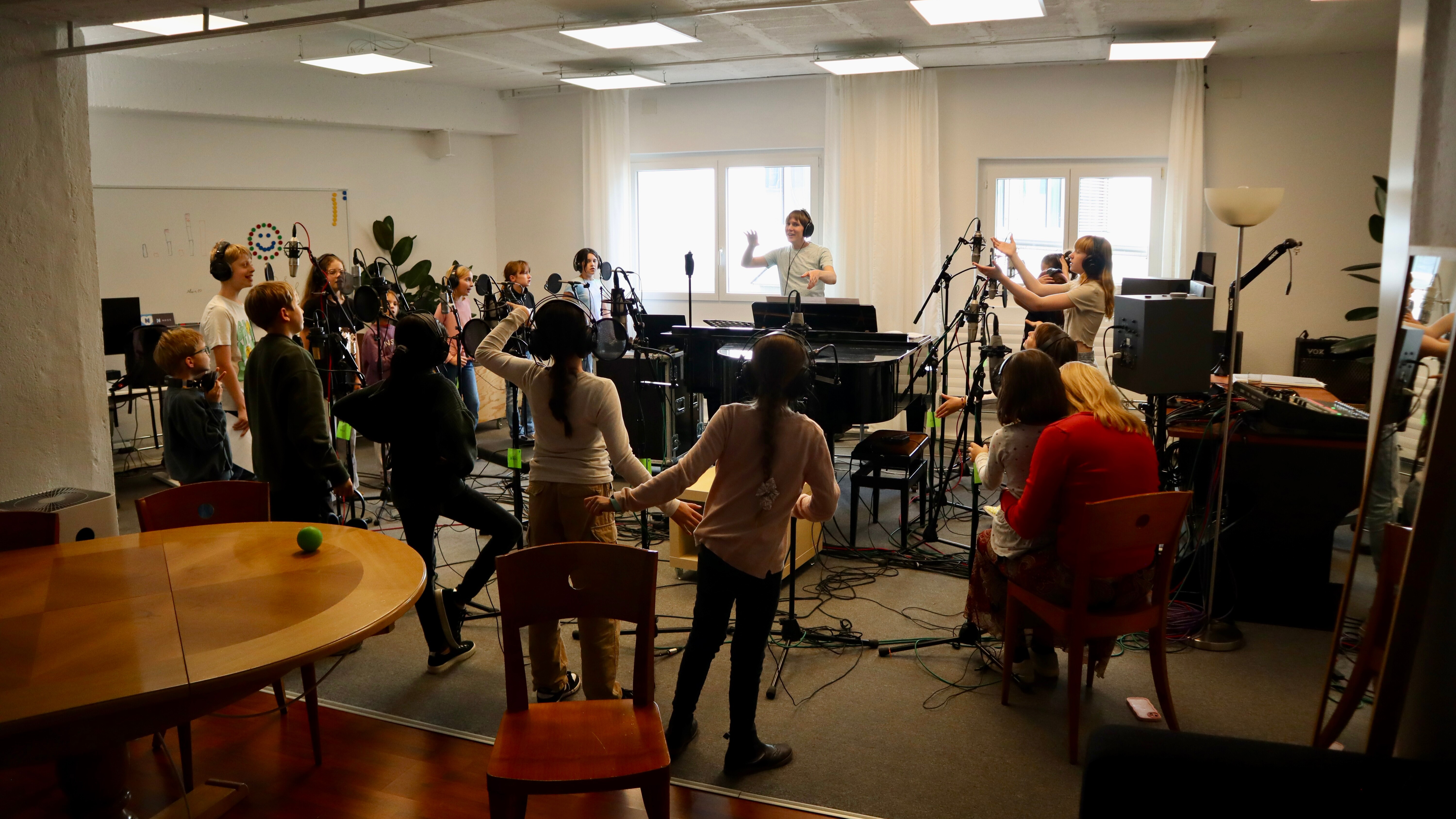 11. Oktober 2024Eine so schnelle Karriere legen normalerweise nur Mitwirkende von Castingshows hin: Zum Abschluss der Workshop-Woche haben wir uns im Studio versammelt, um die einstudierten Lieder aufzunehmen. Was auf den Fotos nach viel Spass aussieht, war aber auch harte Knochenarbeit, die zum Ende der Woche mit einem Apéro belohnt wurde.